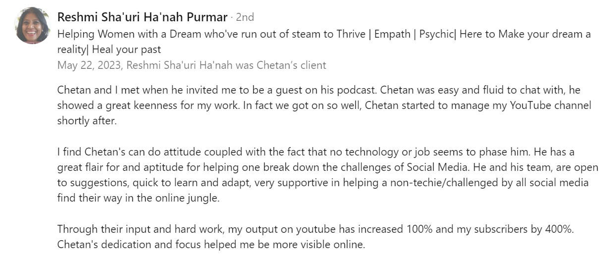 selected testimonialsour clients Zishan KhanDimpy UdhaniHimanshu Agrawal58K Followers InstagramImmanuel WilliamsJeet Shah15K Followers InstagramReshmi PurmarDavid BatesLouise SlatteryManish SinghAkshada PatelManik KaurWinnie RecommendationsWe ask our clients to share their experience with us by posting on social media and here it goes...